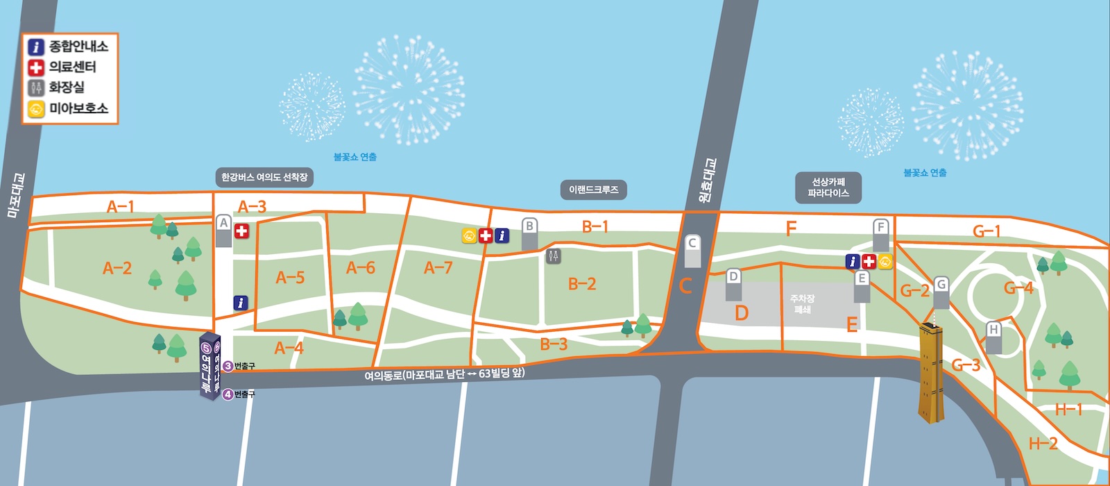 ※ 단, 불꽃축제 당일에는 도로 통제 및 주차장 폐쇄 가능성이 크므로 반드시 예비 계획을 마련하시기 바랍니다.