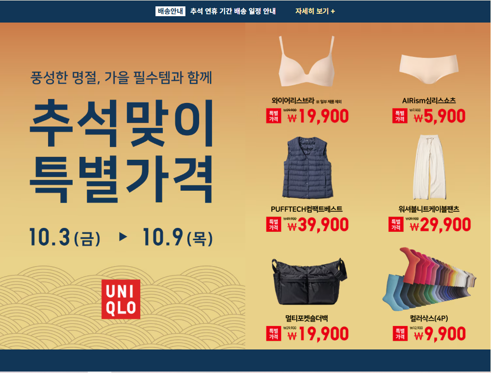 이번 유니클로 추석맞이 가격 세일은 연휴 기간을 중심으로 진행됩니다.