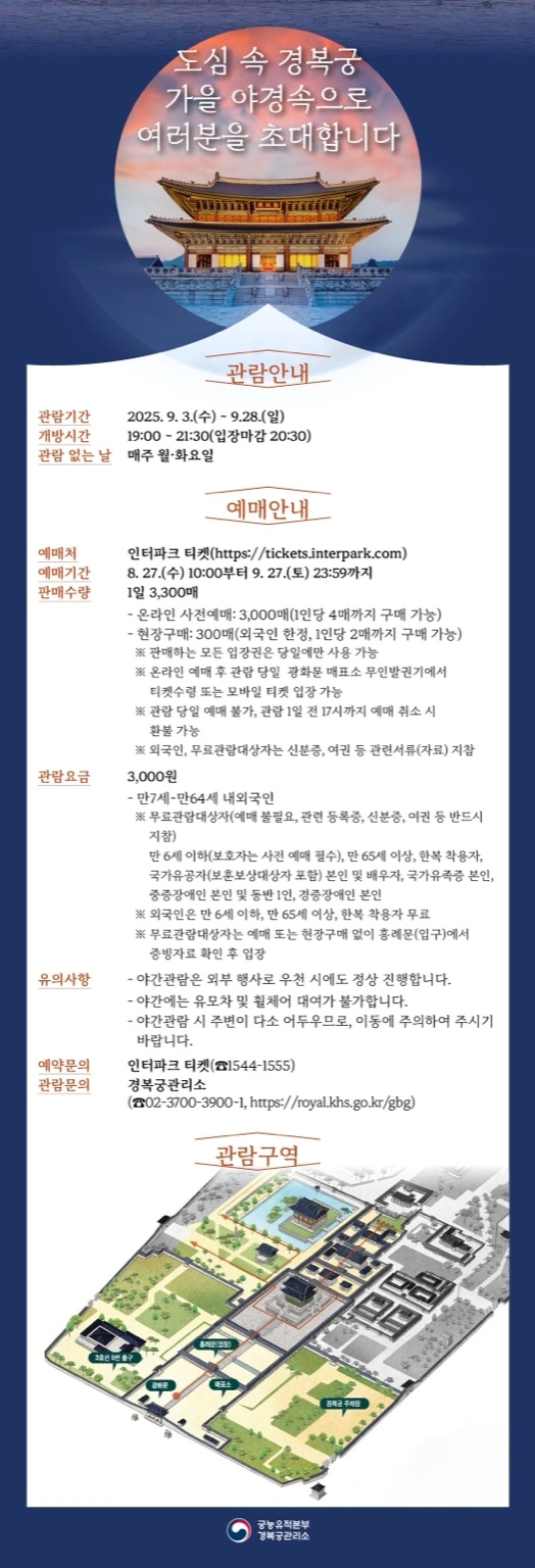 이번 경복궁 야간 관람은 9월 한 달간 진행되며, 사전 예매가 필수입니다.